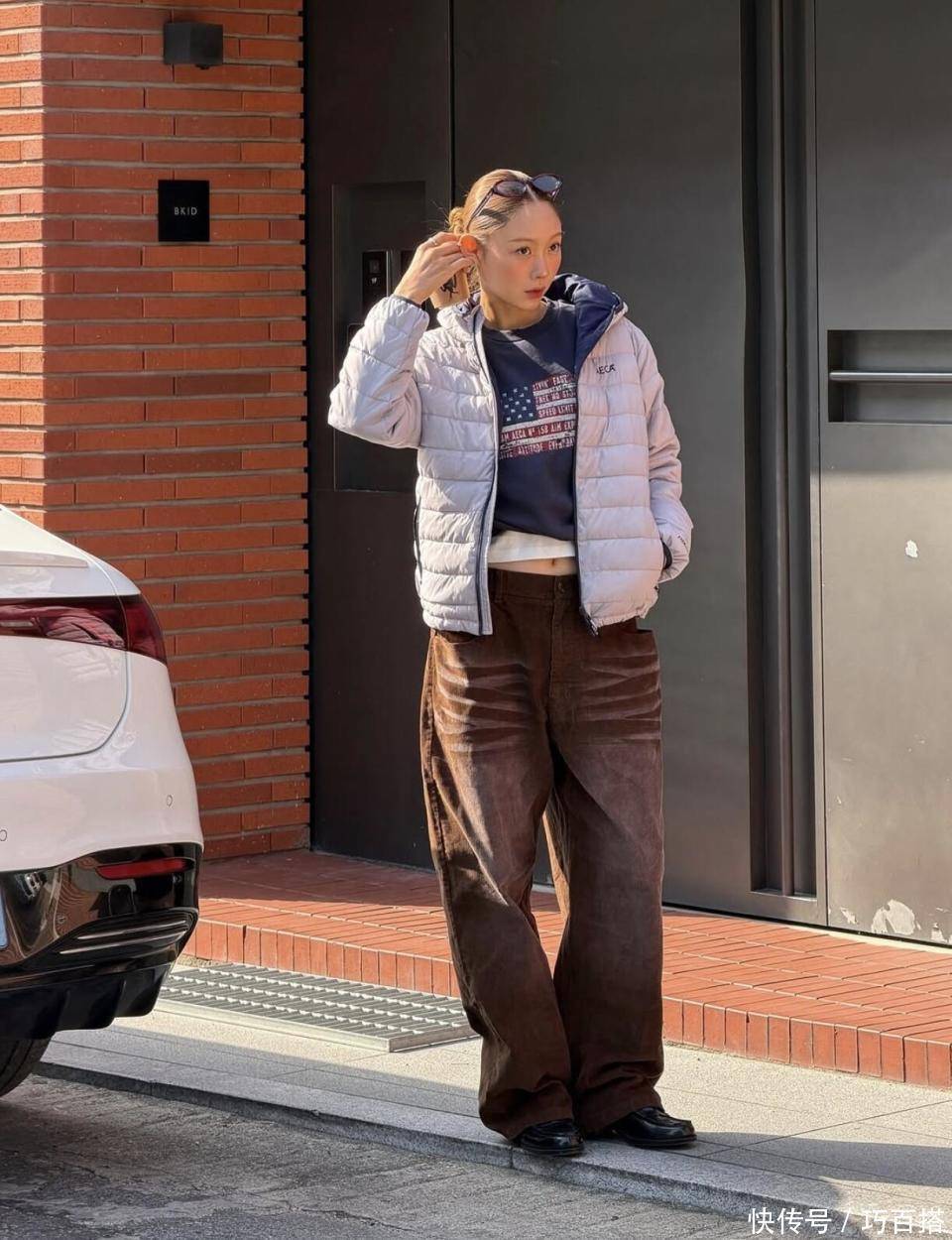 浅灰色羽绒服动作基础色中的一员,它对单品表情的包容性是很牛的,环球像博主相同选拔棕色长裤与之搭配,立马变身韩式辣妹,又酷又柔的嗅觉别提有多nice了。